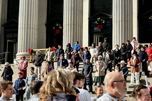 (Minghui.org) Lo scorso 27 novembre è stato il Giorno del Ringraziamento, e la celebrazione annuale si è tenuta a Manhattan, New York, attirando molte persone. I praticanti della Falun Dafa hanno tenuto delle attività di fronte all'ufficio postale degli Stati Uniti in Eighth Street per presentare la pratica spirituale al pubblico. L'ufficio postale si trova di fronte a Penn Station, la principale stazione ferroviaria interurbana di New York e destinazione della parata del Giorno del Ringraziamento di Macy.
