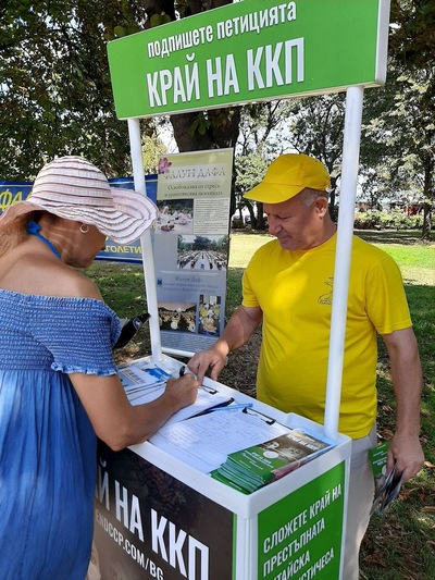 I praticanti hanno esposto striscioni che descrivevano le atrocità del PCC, e hanno anche allestito un tavolo con una petizione che chiede al governo bulgaro di non permettere ai cittadini di essere coinvolti nel crimine del PCC del prelievo forzato di organi dai praticanti.