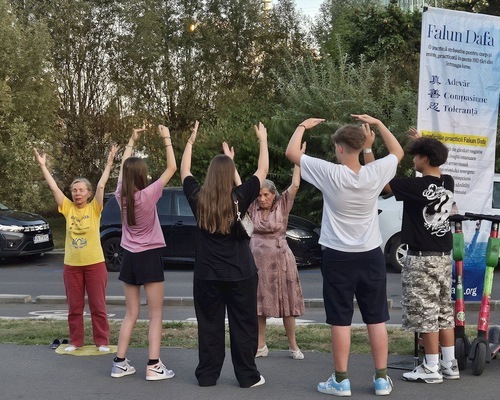 Un gruppo di giovani ha imparato gli esercizi della Falun Dafa a Bucarest, Charles Piazza de Gaulle, all'ingresso del Parco Re Michele I il 30 agosto