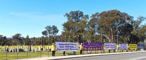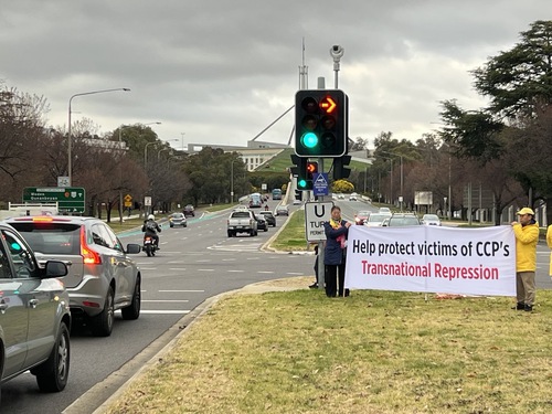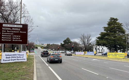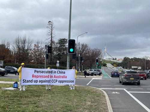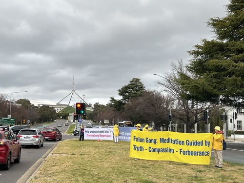 La mattina del 2 settembre, praticanti provenienti da tutta l'Australia hanno esposto striscioni informativi lungo le strade principali che portano al Palazzo del Parlamento nella capitale australiana, per denunciare la repressione transnazionale del PCC. Due degli striscioni recitavano: "Perseguitati in Cina, repressi in Australia, opponetevi all'oppressione del PCC" e "Aiutate a proteggere le vittime della repressione transnazionale del PCC".