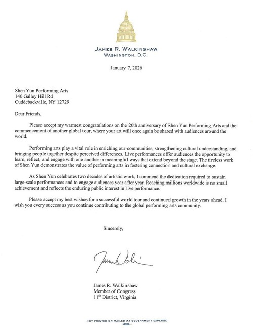 (Minghui.org) Il membro del Congresso degli Stati Uniti James Walkinshaw, in rappresentanza della Virginia, ha scritto una lettera di congratulazioni al gruppo Shen Yun Performing Arts per il 20° anniversario della sua fondazione.