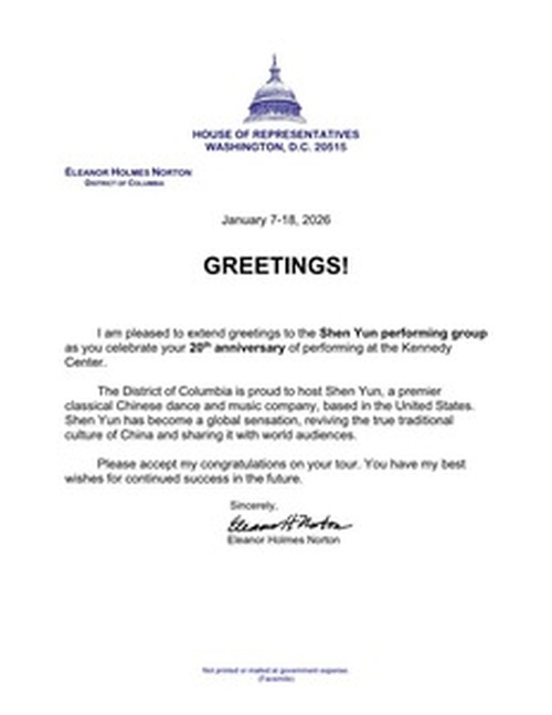 (Minghui.org) Per il 20º anniversario della compagnia Shen Yun Performing Arts, il deputato Eleanor Holmes Norton ha inviato loro i suoi saluti in occasione dell'inizio del nuovo tour dal 7 al 18 gennaio presso il Kennedy Center.