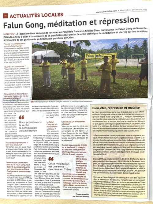 I giornalisti del più grande quotidiano locale, Tahiti Infos, li hanno intervistati, e hanno pubblicato un articolo a tutta pagina intitolato: “Falun Gong, meditazione e repressione”.