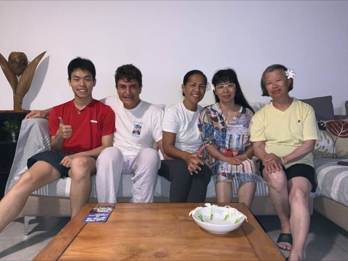 Vahine (al centro) e il marito (secondo da sinistra) hanno scattato una foto di gruppo con i praticanti dopo aver imparato gli esercizi