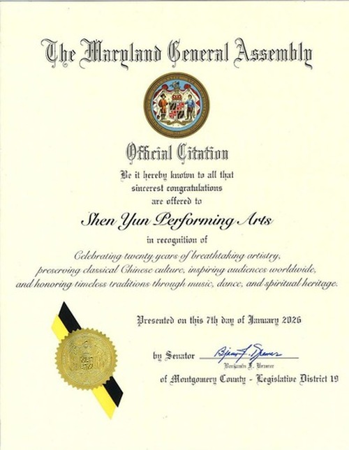 (Minghui.org) Benjamin Kramer, senatore dell'Assemblea Generale del Maryland, ha rilasciato un proclama d'onore ufficiale il 7 gennaio 2026 per congratularsi con Shen Yun Performing Arts.