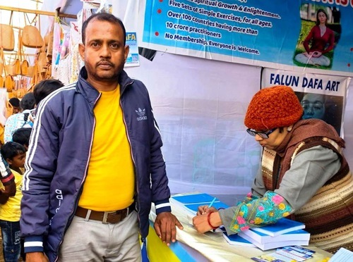 Chatraparti Murmu, insegnante di biologia, ha avuto una lunga conversazione sulla pratica con un praticante allo stand, sostenendo di aver capito che praticare la Falun Dafa aiuta a sviluppare pensieri positivi e a ridurre quelli negativi, e di aver scoperto qualcosa che “gli darà una nuova direzione nella vita”, e poi ha acquistato sia lo Zhuan Falun che il Falun Gong.
