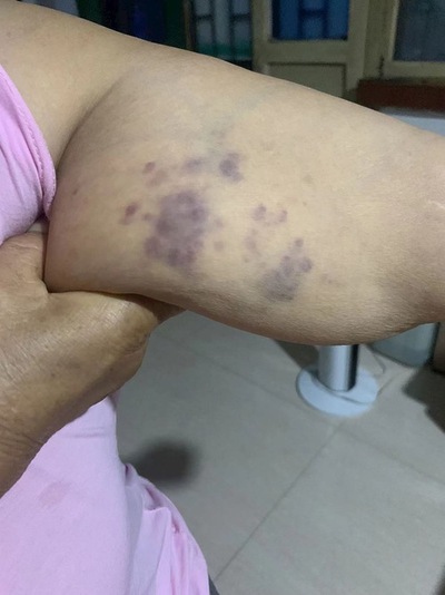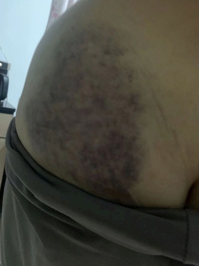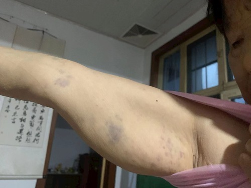 Le braccia della signora Zhang contuse, a causa della violenza della polizia durante il suo arresto