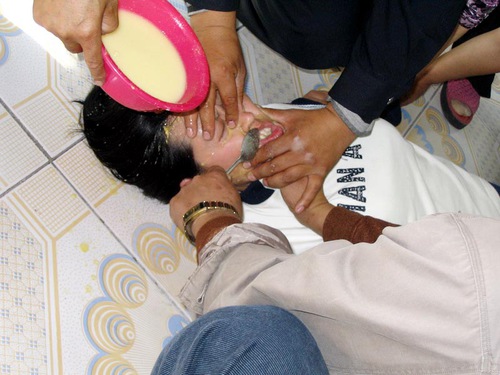 Una detenuta incaricata di sorvegliare le praticanti ha usato uno scopino del water per strofinar loro la bocca. La signora Lyu Yinxia è stata picchiata con uno scopino del water fino a quando non si è rotto. La donna aveva la bocca gonfia e sanguinante.