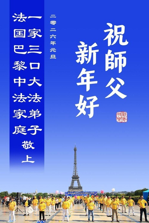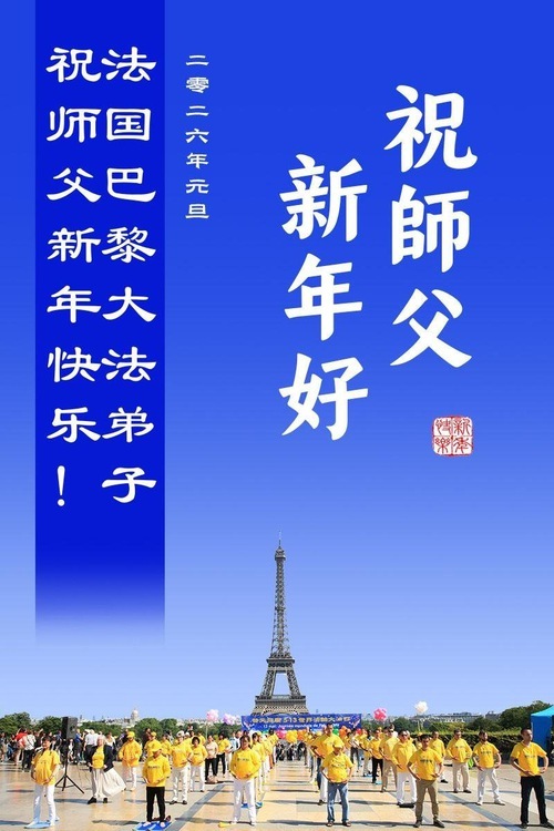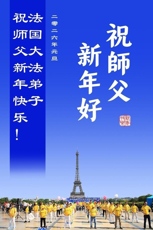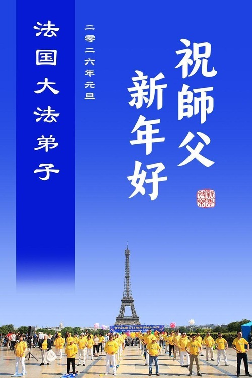I praticanti di un gruppo di studio della Fa a Parigi, Francia, hanno augurato al venerato Maestro un felice anno nuovo!