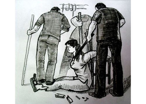 Le guardie ammanettano le praticanti dietro la schiena e percuotono loro al collo, alle ascelle e alle tempie con manganelli elettrici per diverse ore, finché le batterie non si esauriscono.