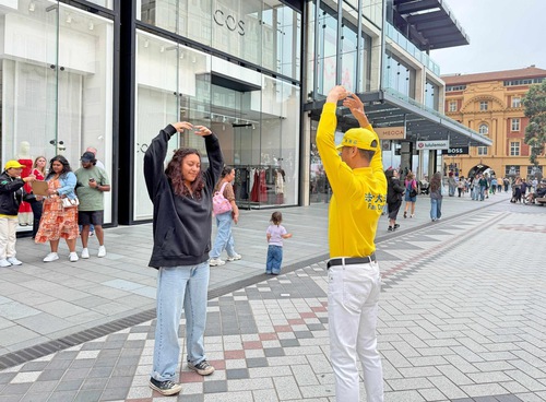 Sigrid e il marito Roland, dalla Germania, hanno notato la pacifica pratica di gruppo, e hanno voluto saperne di più sulla Falun Dafa. Sigrid ha affermato di credere che mente e corpo siano strettamente connessi, e che se si mantiene una mente lucida, un atteggiamento positivo e pensieri sani, si ha meno probabilità di ammalarsi, perché la salute mentale gioca un ruolo importante nella salute generale.