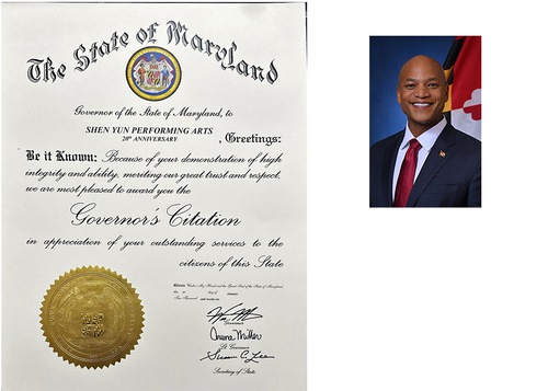 L'encomio recita: "Governatore dello Stato del Maryland, al 20° ANNIVERSARIO DI SHEN YUN PERFORMING ARTS.