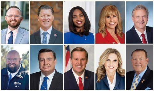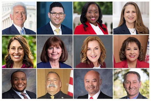 Funzionari eletti a San Diego, California, che hanno rilasciato certificati o proclami per celebrare il ventesimo anniversario di Shen YunPrima fila, da sinistra a destra: Dane White, sindaco di Escondido; Brian Jones, leader della minoranza al Senato dello Stato della California; Akilah Weber Pierson, senatrice dello Stato della California; Laurie Davies, membro dell'Assemblea dello Stato; Jim Desmond, supervisore della contea di San DiegoSeconda fila, da sinistra a destra: Mark Arapostathis, sindaco di La Mesa; Joel Anderson, supervisore della contea di San Diego; John McCann, sindaco di Chula Vista (la seconda città più grande della contea di San Diego); Rebecca Jones, sindaco di San Marcos; e John Minto, sindaco di Santee