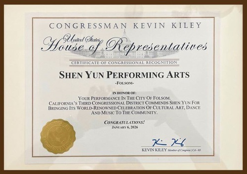 Il certificato del rappresentante Kevin Kiley recita: “Il terzo distretto congressuale della California elogia Shen Yun per aver portato nella comunità la sua celebrazione di fama mondiale dell'arte culturale, della danza e della musica. Congratulazioni!”