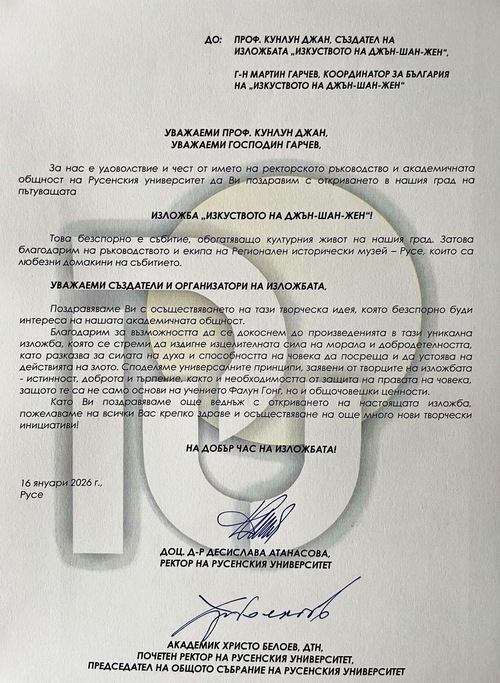 La Prof.ssa Ivanova, inviata speciale della Prof.ssa Desislava Atanasova, Rettore dell'Università Angel Kanchev di Ruse, e del Rettore Onorario Accademico Hristo Beloev, PhD, ha presentato un discorso di congratulazioni al coordinatore della mostra “L’Arte di Zhen-Shan-Zhen” a nome della prof.ssa Atanasova.