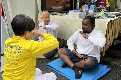 Waswa Kabuye si è fermato allo stand per conoscere meglio la Falun Dafa e sperimentare con essa la meditazione.