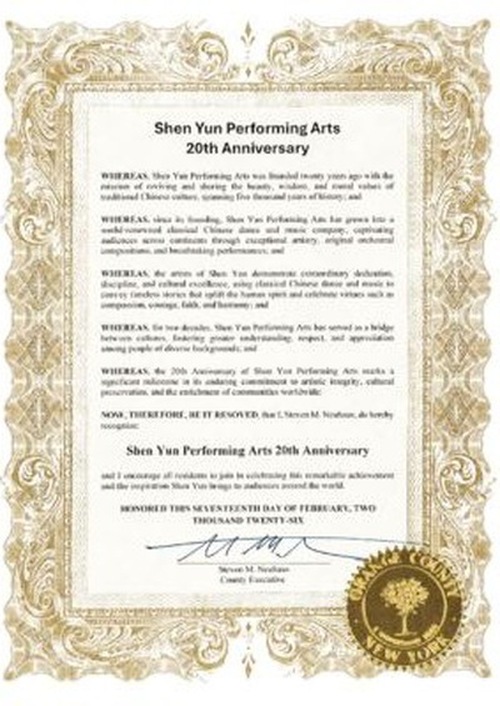 “CONSIDERATO che il ventesimo anniversario di Shen Yun Performing Arts segna una tappa fondamentale nel suo impegno costante verso l'integrità artistica, la conservazione culturale e l'arricchimento delle comunità di tutto il mondo;