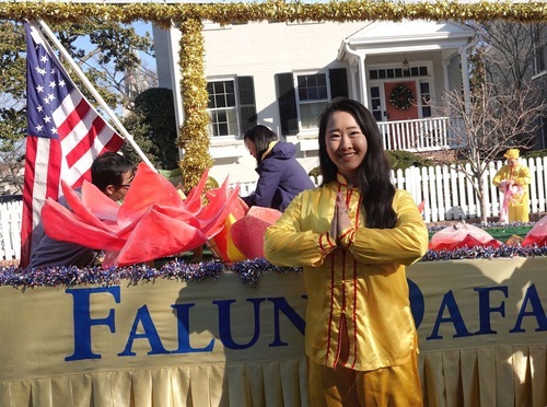 Emily Huang, una giovane praticante che ha dimostrato gli esercizi sul carro allegorico, ha raccontato: "Quando la parata è iniziata e il carro ha cominciato ad avanzare lentamente, ho chiuso gli occhi e ho iniziato a dimostrare gli esercizi. Anche se il tempo era stato freddo nell'ultimo mese, oggi era eccezionalmente sereno e caldo, e il sole splendeva su di noi.Poiché stavo meditando, non ho aperto gli occhi, ma potevo sentire chiaramente la gente che applaudiva e acclamava il nostro carro e il gruppo dei tamburi”.