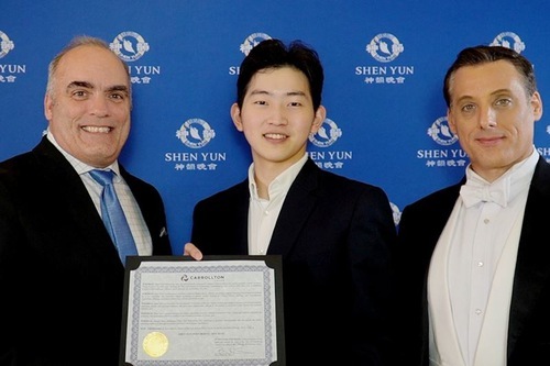 Il 10 febbraio, Steve Babick (a sinistra), sindaco di Carrollton, ha consegnato una proclamazione agli artisti di Shen Yun all'Eisemann Center di Dallas (Schermata per gentile concessione di NTD)