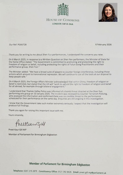 Preet Kaur Gill, deputata di Birmingham Edgbaston, ha scritto: "Il 6 marzo dello scorso anno, in risposta a un'interrogazione scritta sugli artisti di Shen Yen, il Ministro di Stato per il Ministero degli Interni ha dichiarato: Il governo si impegna a promuovere e proteggere il diritto alla libertà di religione o di credo, inclusa la protezione dei diritti dei praticanti del Falun Gong e del loro gruppo di spettacolo, Shen Yun”.