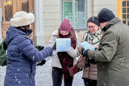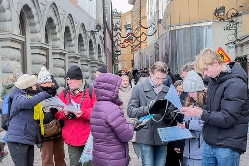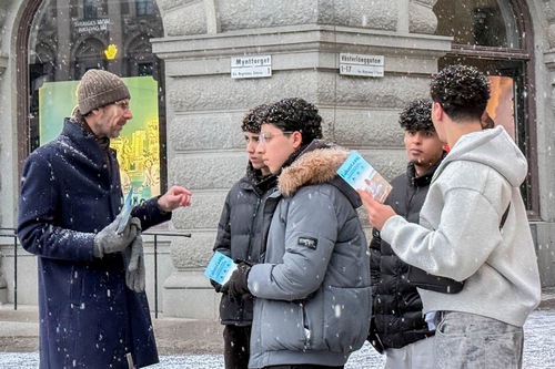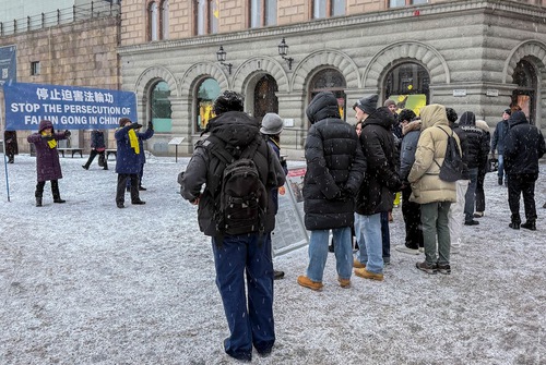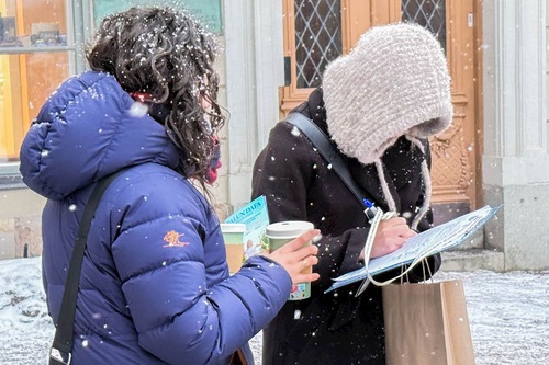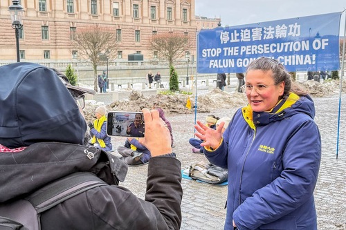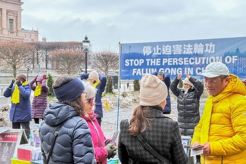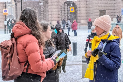 (Minghui.org) Per tutti i sabati pomeriggio del mese di gennaio, i praticanti della Falun Dafa hanno organizzato attività a Mynttorget, una piazza pubblica situata nella città vecchia di Stoccolma, vicino al Parlamento svedese, hanno presentato la pratica spirituale, sensibilizzato l'opinione pubblica sulla persecuzione del Partito Comunista Cinese (PCC), e raccolto firme per una petizione che chiede la fine delle violazioni dei diritti umani in corso in Cina. Nonostante il freddo, molte persone si sono fermate per saperne di più, e hanno firmato la petizione.