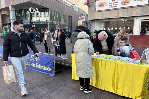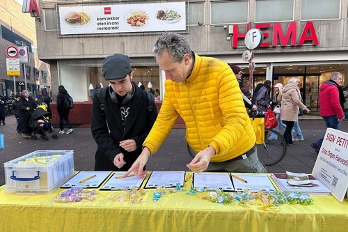 (Minghui.org) Ogni fine settimana, indipendentemente dal freddo invernale o dal caldo estivo, i praticanti allestiscono uno stand informativo in un quartiere commerciale del centro dell'Aia per sensibilizzare l'opinione pubblica sulla persecuzione della Falun Dafa da parte del Partito Comunista Cinese (PCC) in Cina.