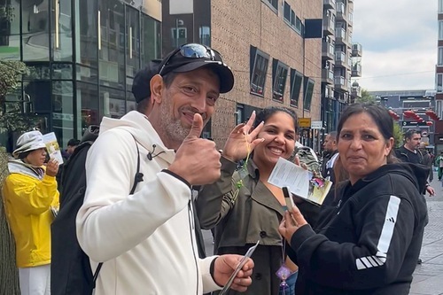 Due professori dell'Università di Leiden, nei Paesi Bassi, si sono avvicinati allo stand e hanno chiesto se i praticanti avessero del materiale scritto in cinese. Hanno spiegato che insegnano biologia e che hanno a che fare con studenti e studiosi cinesi. Hanno scoperto che questi studiosi non erano a conoscenza delle violazioni dei diritti umani che avvengono in Cina. Volevano fornire queste informazioni ai loro colleghi cinesi per aiutarli a scoprire la verità e a liberarsi dall'indottrinamento del PCC.