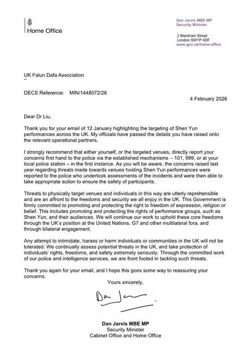 Lettera del ministro della Sicurezza britannico Jarvis all'Associazione Falun Dafa del Regno Unito in merito alle minacce rivolte agli spettacoli di Shen Yun in tutto il Paese