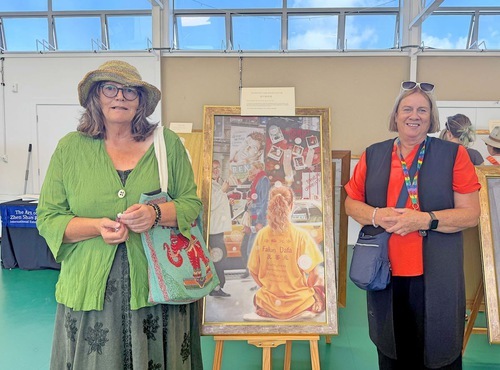 Sharon (a sinistra) e la sua amica Judy osservano i dipinti