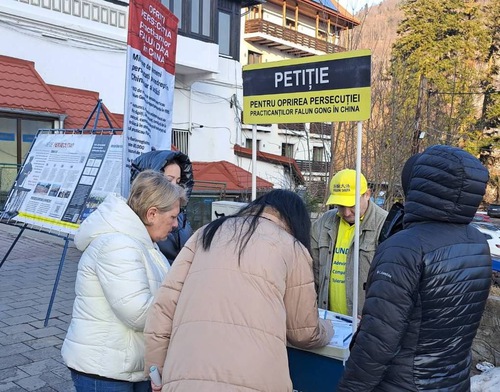 (Minghui.org) Dal 27 febbraio al 1° marzo scorso, i praticanti si sono riuniti a Sinaia, in Romania, per condividere le proprie esperienze di coltivazione. Hanno anche allestito uno stand informativo per presentare la pratica al pubblico e attirare l'attenzione sulla brutale persecuzione in atto in Cina. Le loro attività hanno ricevuto sostegno e molte persone hanno espresso l'auspicio che i valori fondamentali della Falun Dafa vengano promossi nella società. Hanno inoltre incoraggiato i praticanti a continuare a denunciare la persecuzione.
