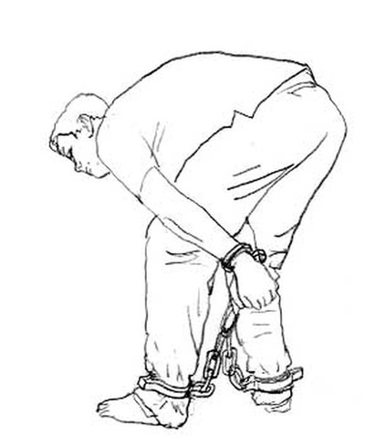 Illustrazione della tortura: mani e piedi uniti in catene