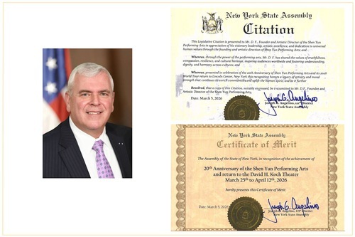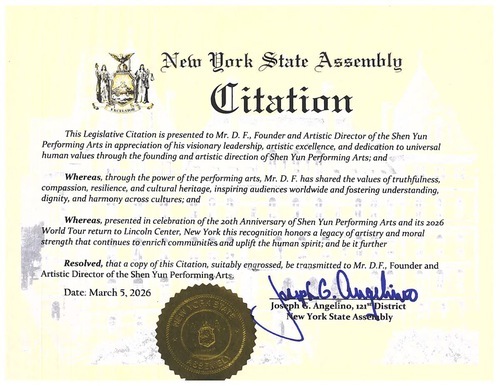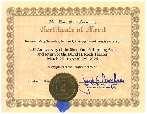 Nel Certificato di Merito il deputato Angelino ha scritto: "L'Assemblea dello Stato di New York, in riconoscimento dei risultati raggiunti da Shen Yun, in occasione del suo 20° anniversario e del suo ritorno al David H. Koch Theater dal prossimo 25 marzo al 12 aprile, conferisce il presente Certificato di Merito”.