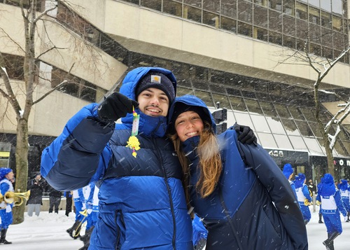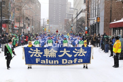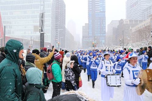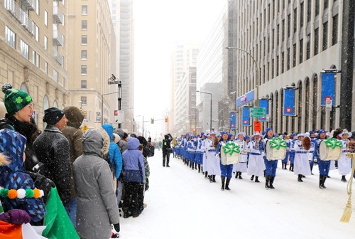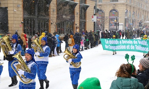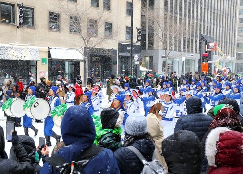 Il giorno della parata ha nevicato, ma il freddo non ha smorzato l’entusiasmo della gente, 92 carri allegorici, bande musicali e gruppi della comunità sono partiti da Fort Street, e si sono diretti verso est lungo il Boulevard Maisonneuve. Gli spettatori lungo il percorso hanno applaudito e acclamato, e spesso si sentiva la folla gridare “Falun Dafa” al passaggio della banda.