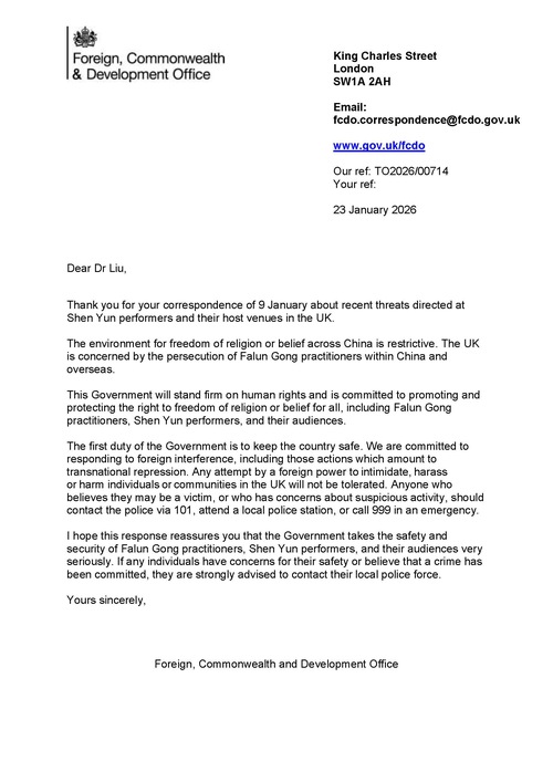 Dopo che i teatri hanno ricevuto numerose minacce, il 23 gennaio il Ministero degli Esteri, del Commonwealth e dello Sviluppo, ha inviato una lettera all’Associazione Falun Dafa del Regno Unito, l’organizzatrice degli spettacoli di Shen Yun.