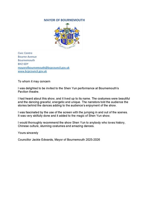 In questa stagione, il tour britannico di Shen Yun ha toccato Inghilterra, Scozia e Galles, dove erano presenti diversi sindaci, tra cui: il sindaco di Oxford Louise Upton, l’ex sindaco di Harrow Ramji Chauhan, il sindaco di Bournemouth Jackie Edwards, il sindaco di Llandudno Antony Bertola, l’ex sindaco di Llandudno Carol Marubbi, il sindaco di Stoke-on-Trent Steve Watkins e il sindaco di High Wycombe Majid Hussain.