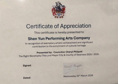 Il 25 marzo, Cheryl Philpott, sindaco di Swansea, e il marito, hanno consegnato un attestato di riconoscimento agli artisti di Shen Yun alla Swansea Building Society Arena