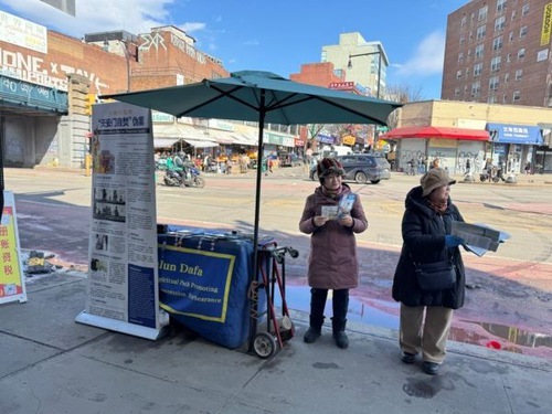 I praticanti di New York hanno allestito cinque stand in Main Street a Flushing, una delle più grandi comunità cinesi della città, per parlare alla gente del Falun Gong e confutare la propaganda d'odio del PCC. Indipendentemente dal caldo torrido o dal freddo gelido, dal vento o dalla pioggia, continuano a parlare alla gente del Falun Gong e di come il PCC lo perseguiti.