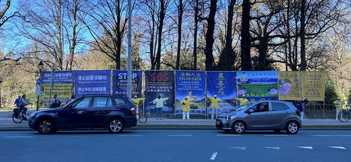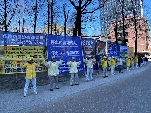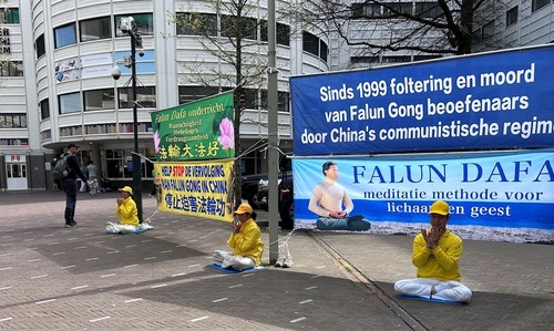 I praticanti hanno esposto striscioni accanto alla sede temporanea della Camera dei Rappresentanti, lungo il lato sud di Prinses Irenepad e il lato nord di Bezuidenhoutseweg. Gli striscioni recitavano: "Basta con la persecuzione del Falun Gong", "26 anni di resistenza del Falun Gong alla persecuzione", "Basta con il prelievo di organi e l'omicidio dei praticanti del Falun Gong", "La Falun Dafa si è diffusa in oltre 100 paesi, apportando benefici alla mente e al corpo di centinaia di milioni di persone" e "Il mondo ha bisogno di Verità, Compassione e Tolleranza".