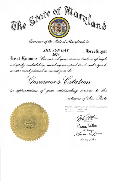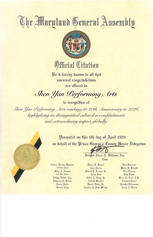 L’encomio è datato 18 aprile, primo giorno degli spettacoli di Shen Yun a Baltimora, ed è stato firmato anche dal vice governatore Aruna Miller e dal segretario di Stato Susan C. Lee.