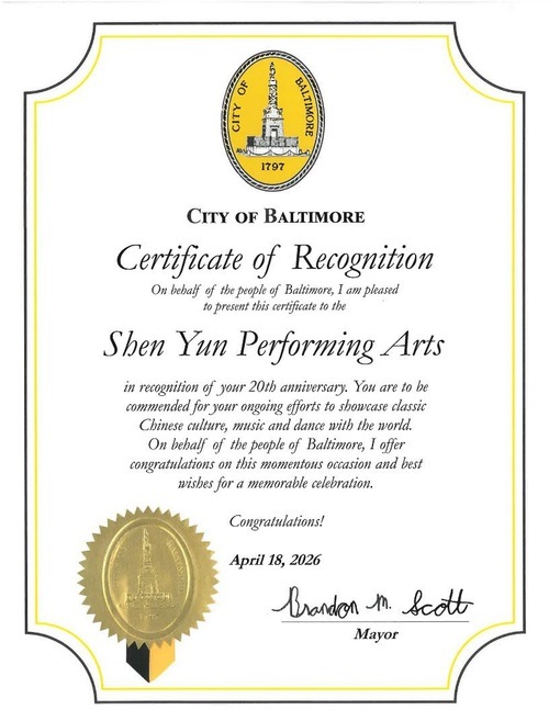 Il sindaco Brandon M. Scott ha scritto: “A nome dei cittadini di Baltimora, sono lieto di consegnare questo attestato alla Shen Yun Performing Arts in occasione del vostro 20º anniversario. Meritate un elogio per il vostro impegno costante nel far conoscere al mondo la cultura, la musica e la danza classica cinese. A nome dei cittadini di Baltimora, vi porgo le mie congratulazioni per questa importante ricorrenza, e vi auguro una celebrazione indimenticabile”.
