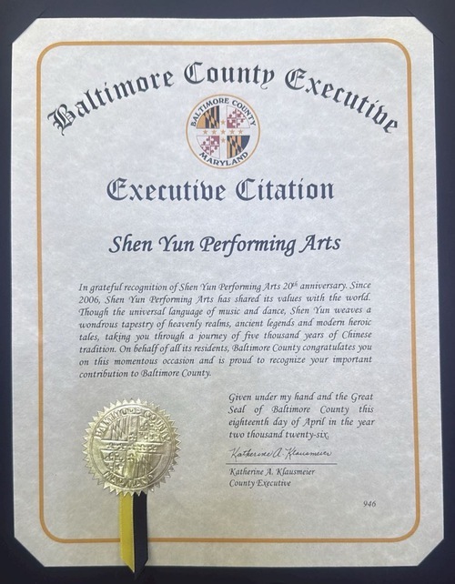 L’amministratore della contea Katherine A. Klausmeier ha scritto: “In segno di gratitudine per il 20° anniversario di Shen Yun Performing Arts. Dal 2006, Shen Yun condivide i propri valori con il mondo, attraverso il linguaggio universale della musica e della danza, Shen Yun viaggia in un meraviglioso arazzo di regni celesti, antiche leggende e racconti eroici moderni, accompagnandovi in un viaggio attraverso 5000 anni di tradizione cinese. A nome di tutti i suoi residenti, la Contea di Baltimora si congratula con voi per questa occasione così importante ed è orgogliosa di riconoscere il vostro importante contributo alla Contea di Baltimora”.