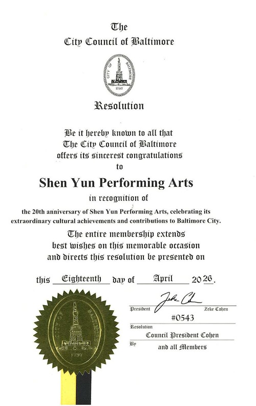 (Minghui.org) In vista dell'esibizione del 18 e 19 aprile della Shen Yun Performing Arts presso l'Hippodrome Theatre, il Consiglio comunale di Baltimora ha approvato una risoluzione che riconosce gli "straordinari risultati culturali e il contributo alla città di Baltimora".