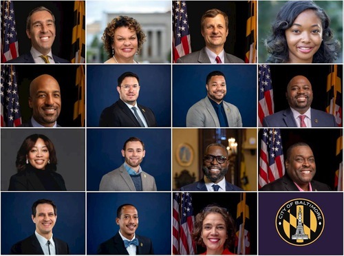 (Da sinistra a destra, dalla prima alla quarta fila) Il presidente del Consiglio comunale di Baltimora Zeke Cohen; la vicepresidente Sharon Green; i consiglieri comunali Mark Parker, Danielle McCray, Mark Conway, Isaac “Yitzy” Schleifer, James Torrence, Paris Gray, Phylicia Porter, Zac Blanchard, Jermaine Jones, Antonio Glover, Ryan Dorsey, John T. Bullock e Odette Ramos