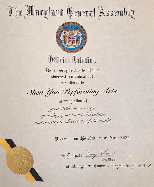 Le congratulazioni ufficiali del deputato dello Stato del Maryland Greg Wims alla Shen Yun Performing Arts in occasione del 20° anniversario della compagnia