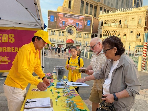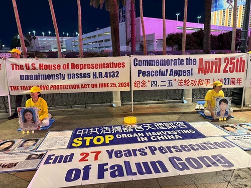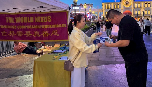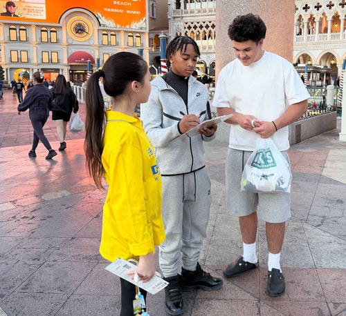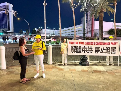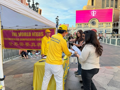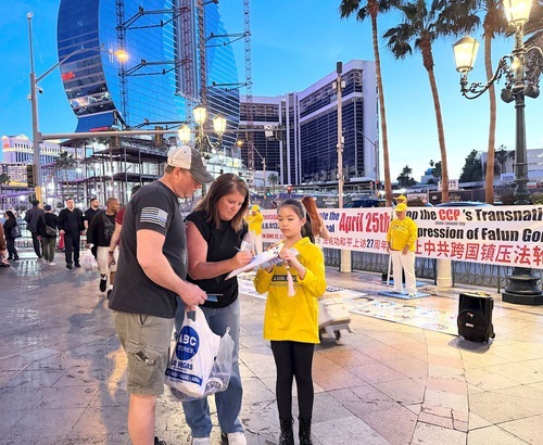 (Minghui.org) Lo scorso 18 aprile, i praticanti del Falun Gong hanno organizzato un evento davanti all'Hotel Venetian di Las Vegas per commemorare l’appello pacifico di 27 anni fa. Dopo che decine di praticanti furono arrestati a Tianjin, circa 10.000 praticanti si sono radunati nei pressi dell'Ufficio statale per le petizioni a Pechino il 25 aprile 1999 per chiederne il rilascio, e la questione fu risolta pacificamente dall'allora premier Zhu Rongji.