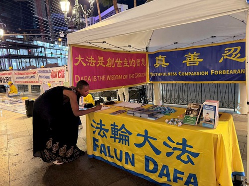 Un turista proveniente dal Regno Unito ha chiesto se poteva firmare una petizione, un praticante gli ha mostrato quella che sensibilizzava l’opinione pubblica internazionale sulla questione, e lui l’ha firmata. “Quando tornerò nel Regno Unito, ne parlerò alla mia famiglia e a tutti i miei amici”, ha sostenuto.