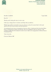 “Vi assicuro che mi opporrò a ogni forma di persecuzione e discriminazione”, ha scritto il deputato Cameron Thomas. “Come già indicato in precedenti comunicazioni da parte del mio ufficio, sono consapevole della minaccia che la Cina rappresenta per gli interessi del Regno Unito sia sul territorio nazionale che all’estero, nonché per i suoi vicini e i propri cittadini. Continuerò a esercitare pressioni sul Governo affinché difenda i nostri valori nei suoi rapporti con il Partito Comunista Cinese”.