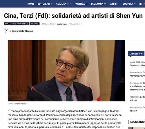 Giulio Terzi, senatore ed ex ministro degli Esteri italiano, ha inviato una lettera di sostegno a Shen Yun, pubblicata da diversi organi di stampa. L'immagine è uno screenshot del sito web di uno di questi media