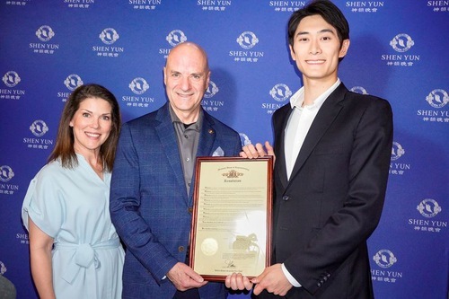 Il deputato dello Stato del Missouri George Hruza (al centro) e sua moglie hanno consegnato un attestato a Shen Yun durante il secondo spettacolo del 21 marzo. (Screenshot per gentile concessione di NTD Television)