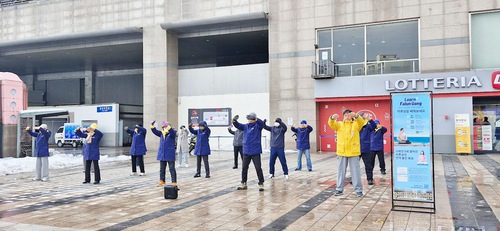 Ogni fine settimana i praticanti dimostrano gli esercizi nella piazza della stazione di Suwon, distribuiscono volantini e rispondono alle domande della gente. Molti turisti cinesi si dimettono dalle organizzazioni del PCC dopo aver ascoltato la vera storia dietro la persecuzione.
